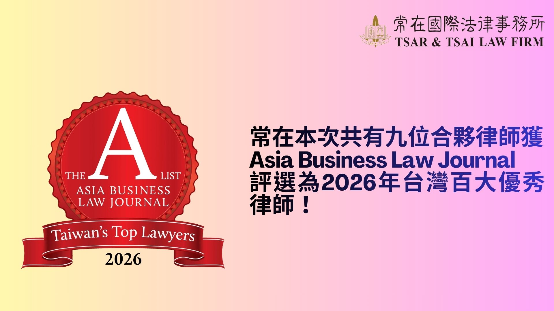 本所欣然宣布,于《Asia Business Law Journal》公布之 2026 年台湾百大顶尖律师(A‑List) 评选中,本所共有九位合伙律师荣誉入选,展现本所在专业实力与市场影响力上的高度肯定。